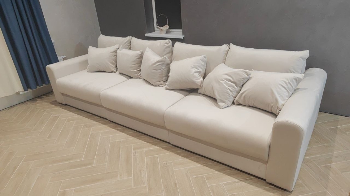 Отличная компания, доставили собрали в срок по предварительной договоренности Материал качественный, отмывается все влажными салфетками. Подушки набивают от души, даже вытаскивала синтепон, чтобы мягче было сидеть) из недостатков я бы отметила что он слишком глубокий и занимает больше места чем классический диван, на нем удобнее лежать, чем сидеть просто